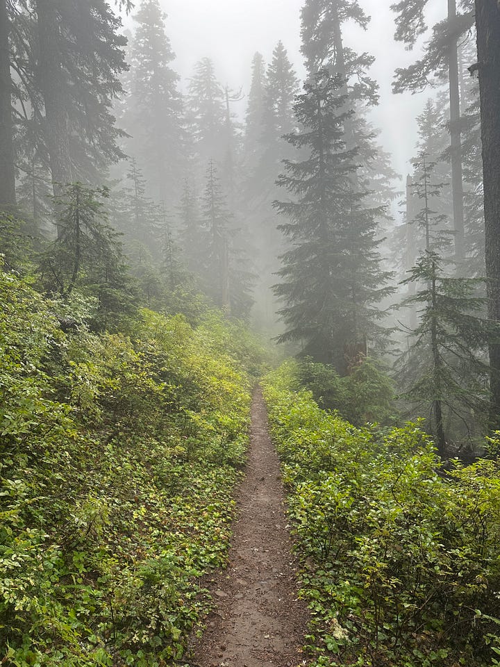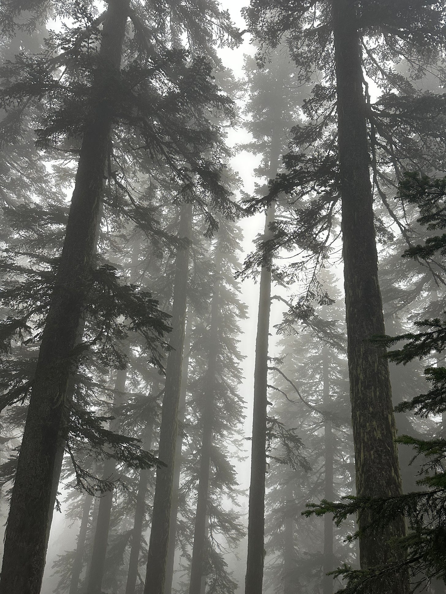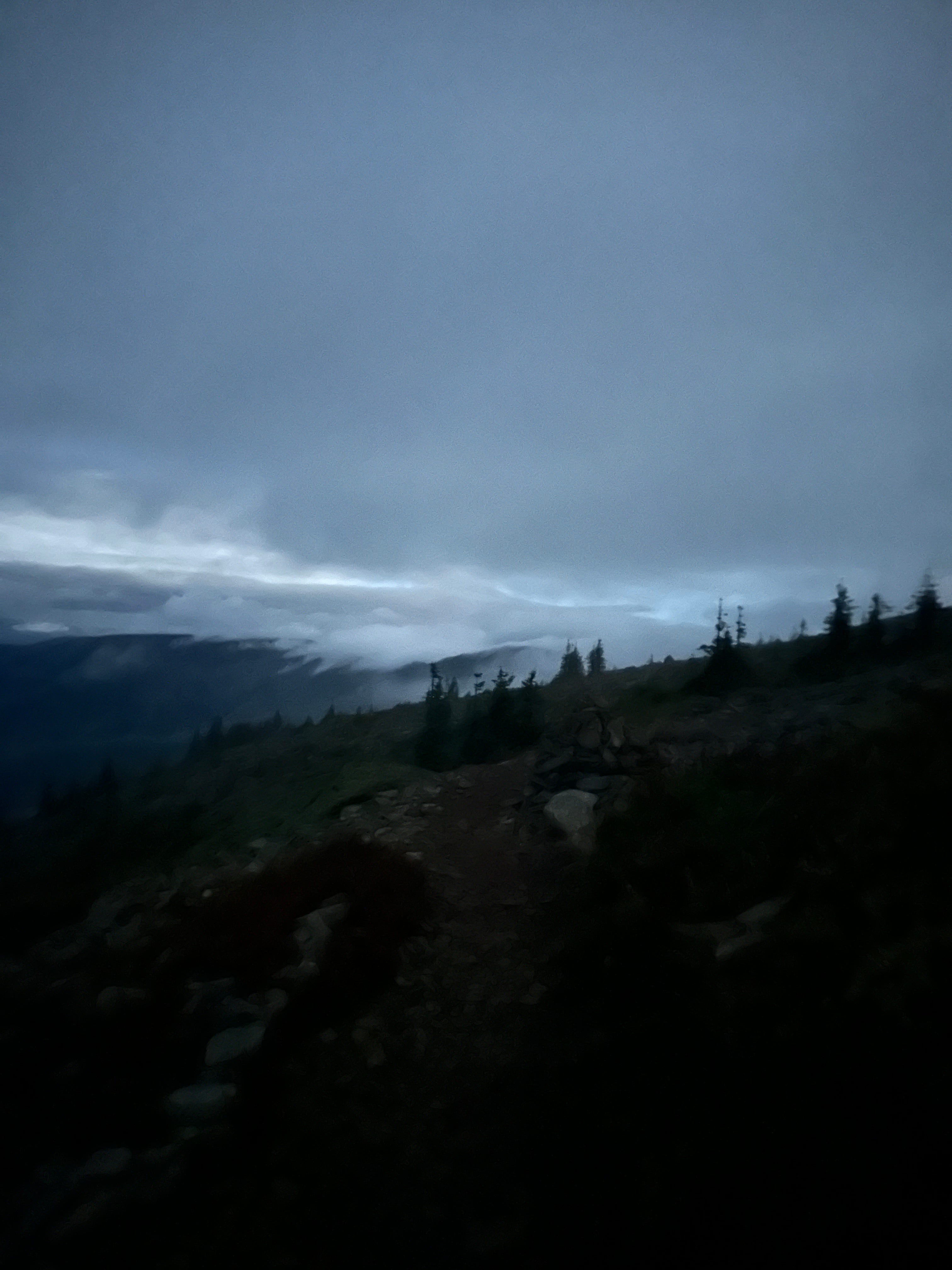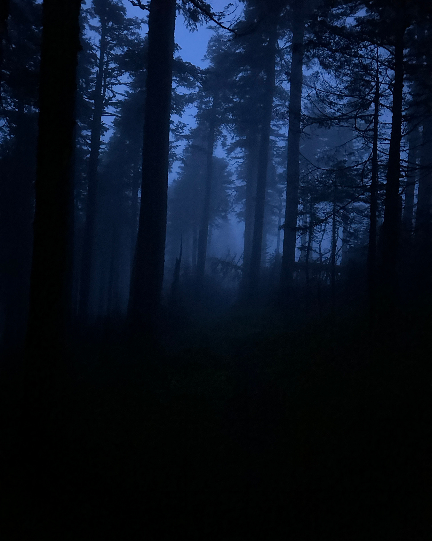 The first few hours are spooky but uneventful. It’s very dark, the trees are tall and create a dense canopy that blocks the light from the night sky. I walk through many long sections of mist and fog where visibility is limited to 10-20 feet. I use only the red light in my headlamp in order to preserve my night vision, and also because I’ll run out of battery if I switch to the more powerful white light. Periodically, I look behind to see if anything is following me but there is never an issue.