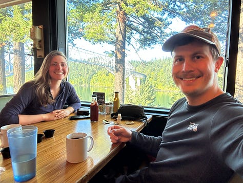 Over the course of the night my eyes adjust significantly to the low light but I find that I’m still hiking slower than I do during the day. I think it’s because it takes me a half-second longer to read the upcoming terrain in the low light. I make it to Cascade Locks at 6am and check into the Best Western hotel. 18 hours, 40 miles, and a few snack breaks. A slower pace than my friend’s day in the desert, but that doesn’t bother me. It feels great to put my backpack down and be inside. I stretch, change clothes, and meet up with Earlybird for breakfast — she had already been in Cascade Locks. We go to the Bridgeside diner and sit by a window overlooking the famed Bridge of the Gods.