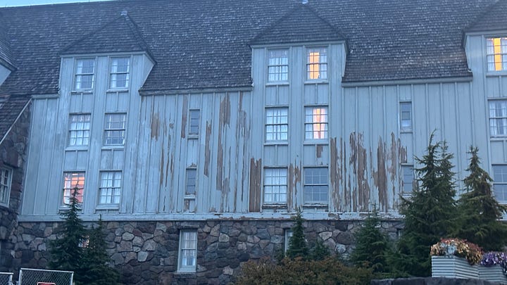 Sept 26/27: The Timberline Lodge does not disappoint. Hiking up the backside of Mt Hood — the lodge is halfway up the mountain — is an ominous experience that matches the tone of The Shining. The lights of the lodge faintly appear through the thick fog and rain. I am alone and haven’t seen anyone the entire day. The trail winds around steep slopes that drop hundreds of feet down volcanic scree. Upon arrival, the staff inform me that it’s the off-season and the lodge is mostly empty. They give me a PCT discount plus a $50 food voucher. I ask for room #237 and the attendant tells me the room does not exist. I’m not the first person to make this request. I end up staying in room #5.